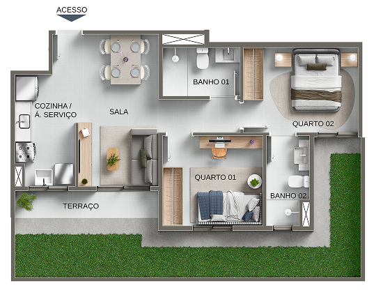 O Singulare conta com duas torres com apartamentos de dois quartos com e sem suíte, além de apartamentos dois quartos com garden, uma área privativa que vai além da área do seu apartamento.